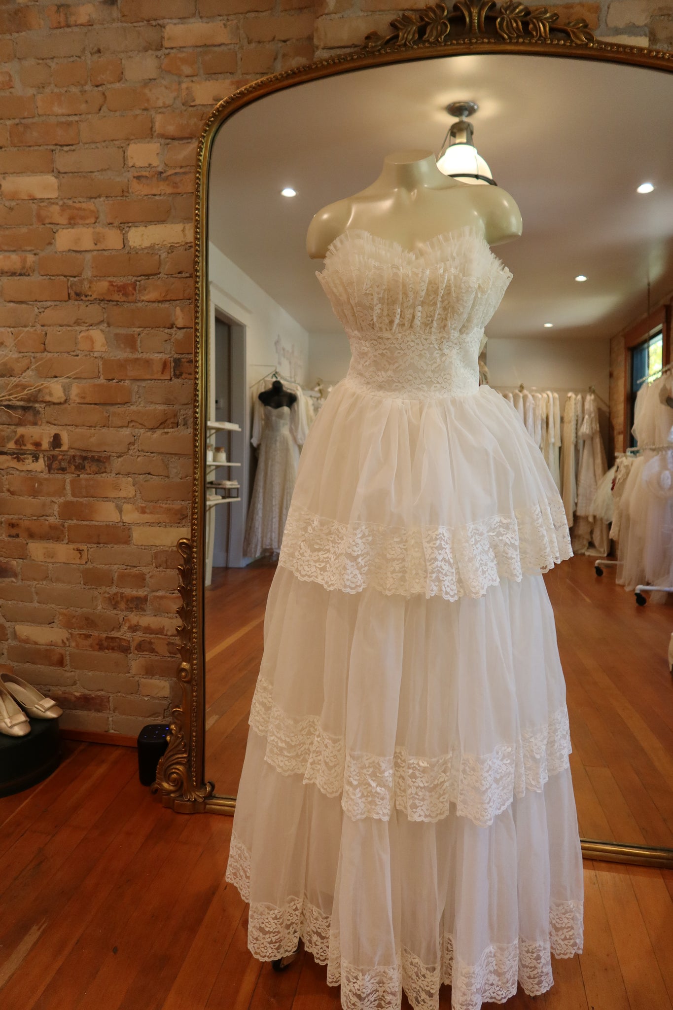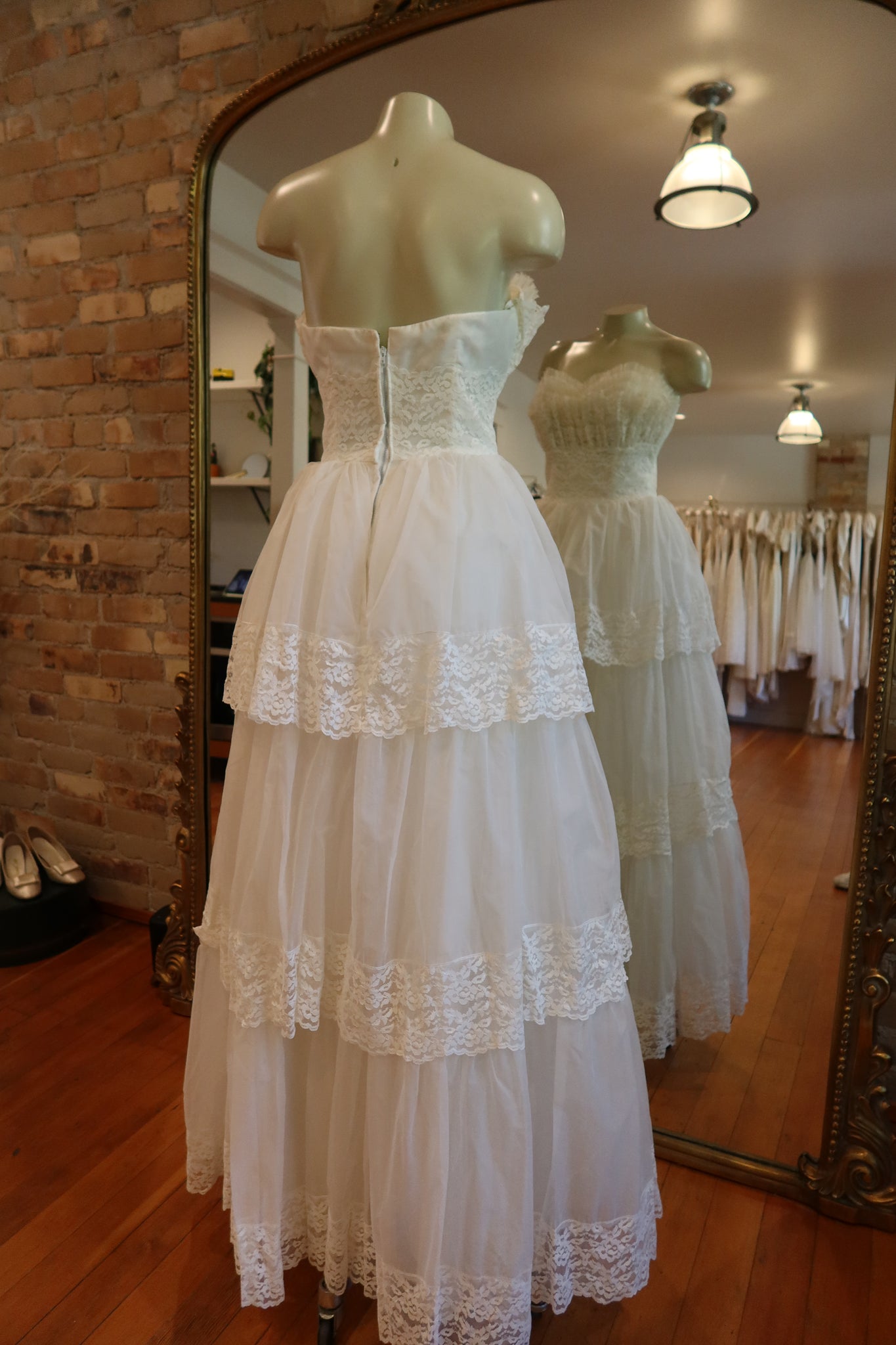Beautiful 1950s strapless lace & tulle ruffled gown. One of our most popular gowns. This was pulled off the floor as I considered this for my own wedding, but have decided it’s just not fitting for our ceremony!