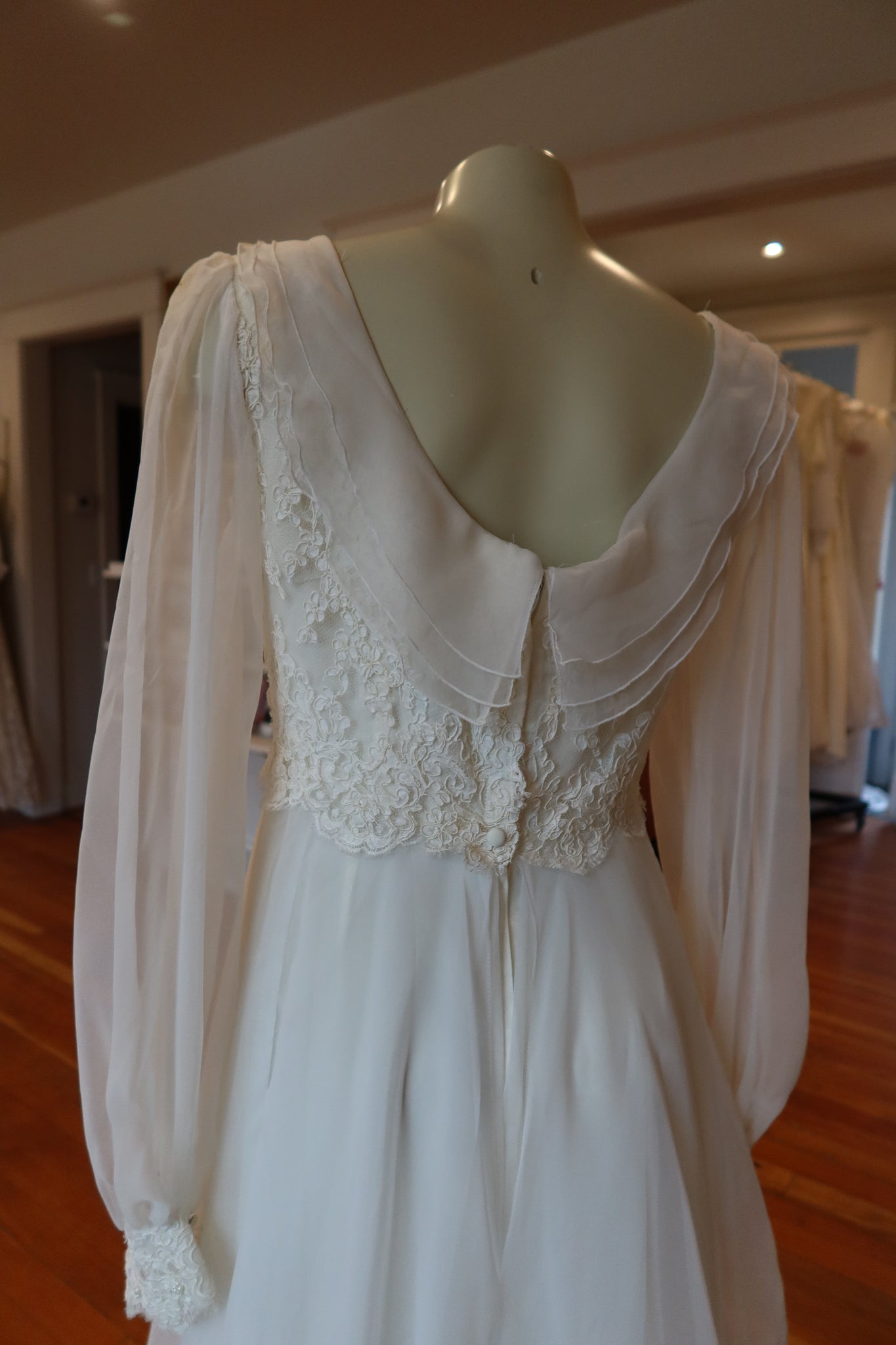 1970s empire waist and elegant bishop sleeves adorned with pearl accents! The double-layer chiffon construction adds beautiful movement, while a tiered ruffle cascades along the back edge, creating a soft, romantic train.