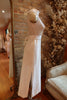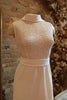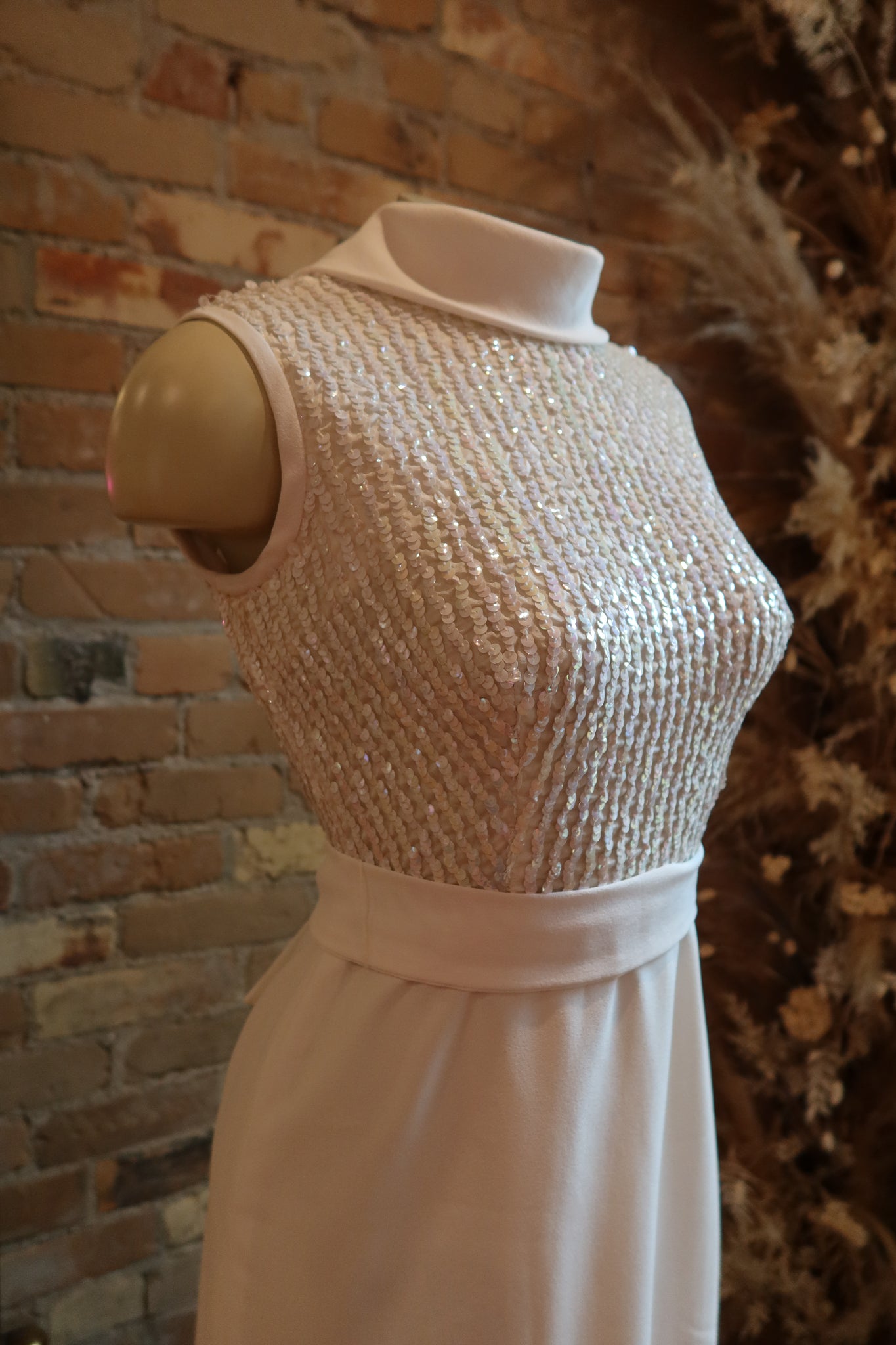 Super fun 1960s dress featuring a structured silhouette with a high mock neck (or wingtip collar), belted waist, and shimmering white sequin bodice! Great for a reception, after-party look, or getaway gown!