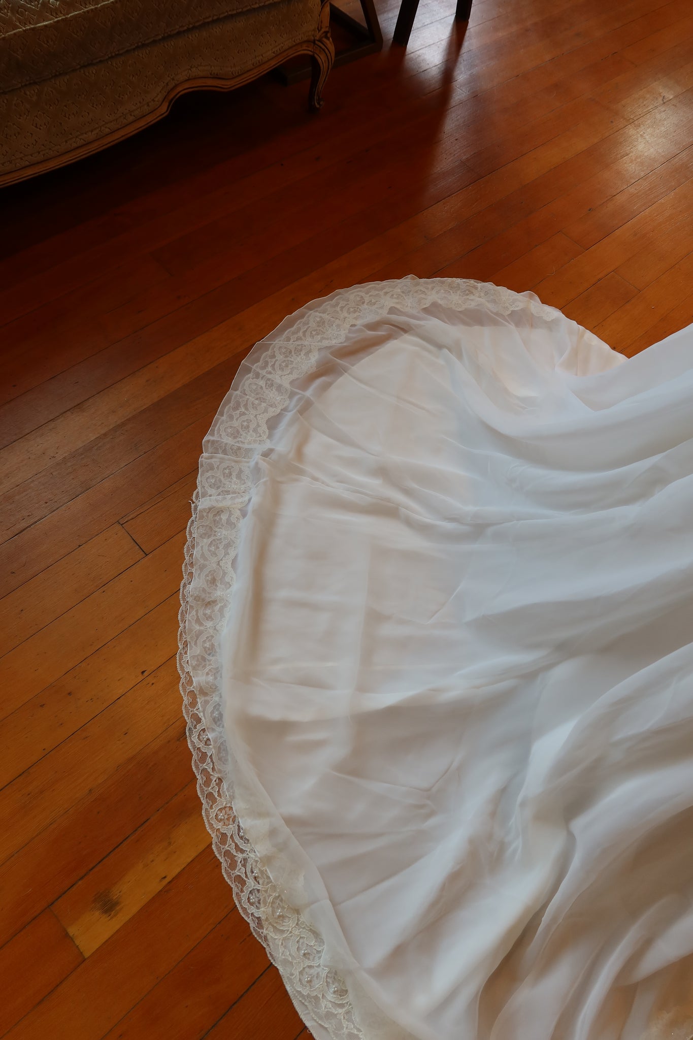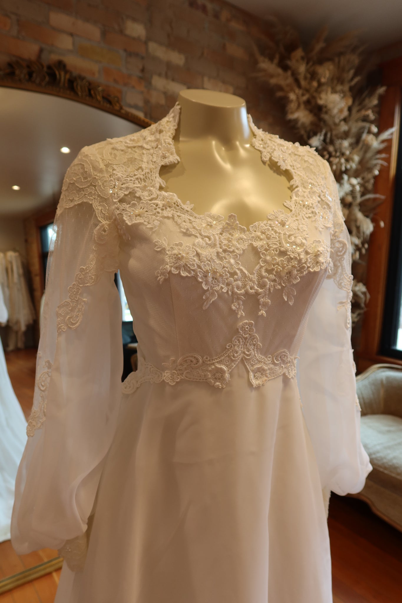 Soft white chiffon gown featuring a fitted lace bodice with scalloped neckline and long sheer bishop sleeves. The bodice is detailed with floral appliqué and light beading.