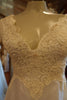 Scalloped lace bodice with cap sleeves and a deep illusion neckline, flowing into a sheer organza skirt with a subtle train.
