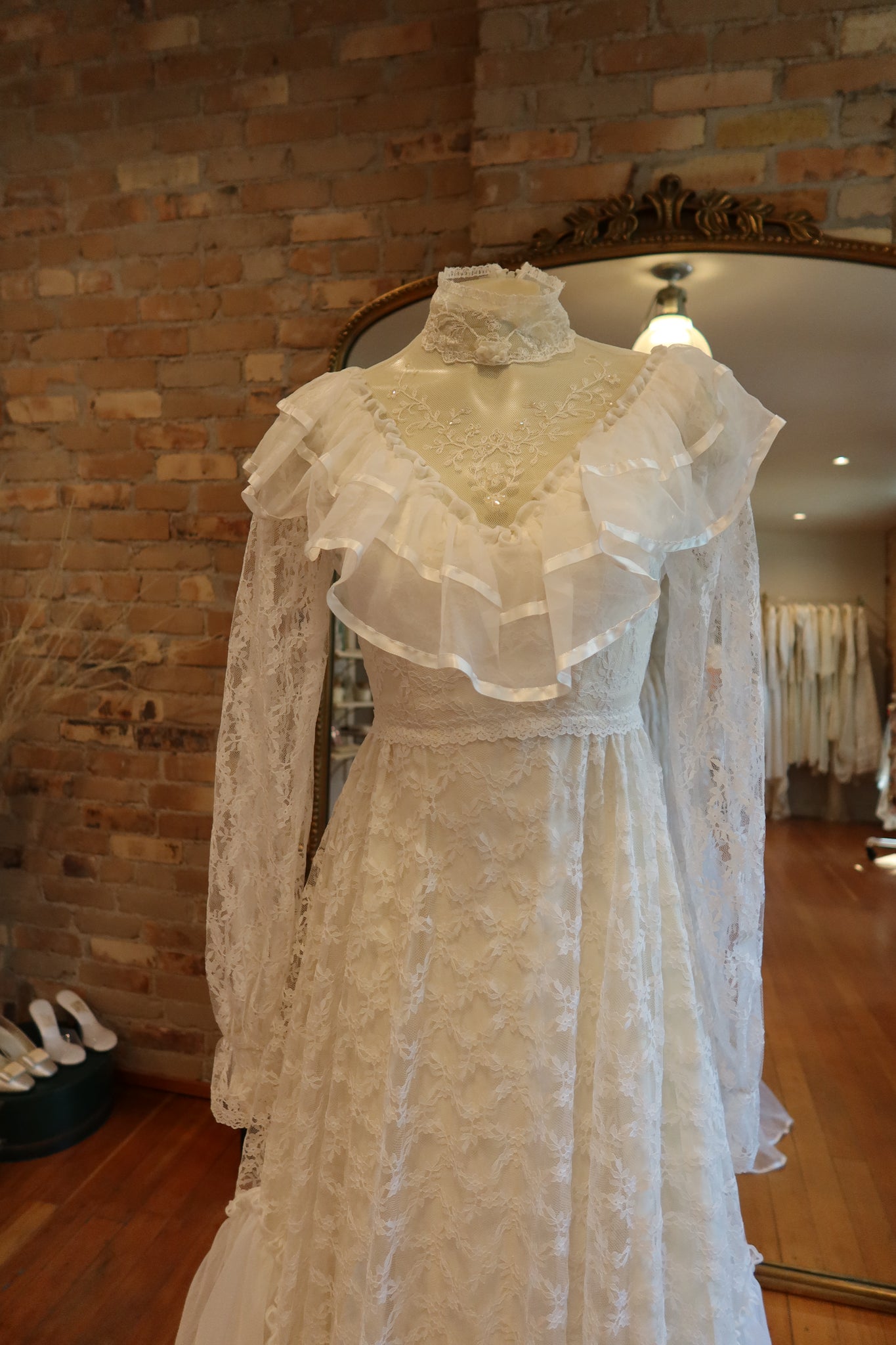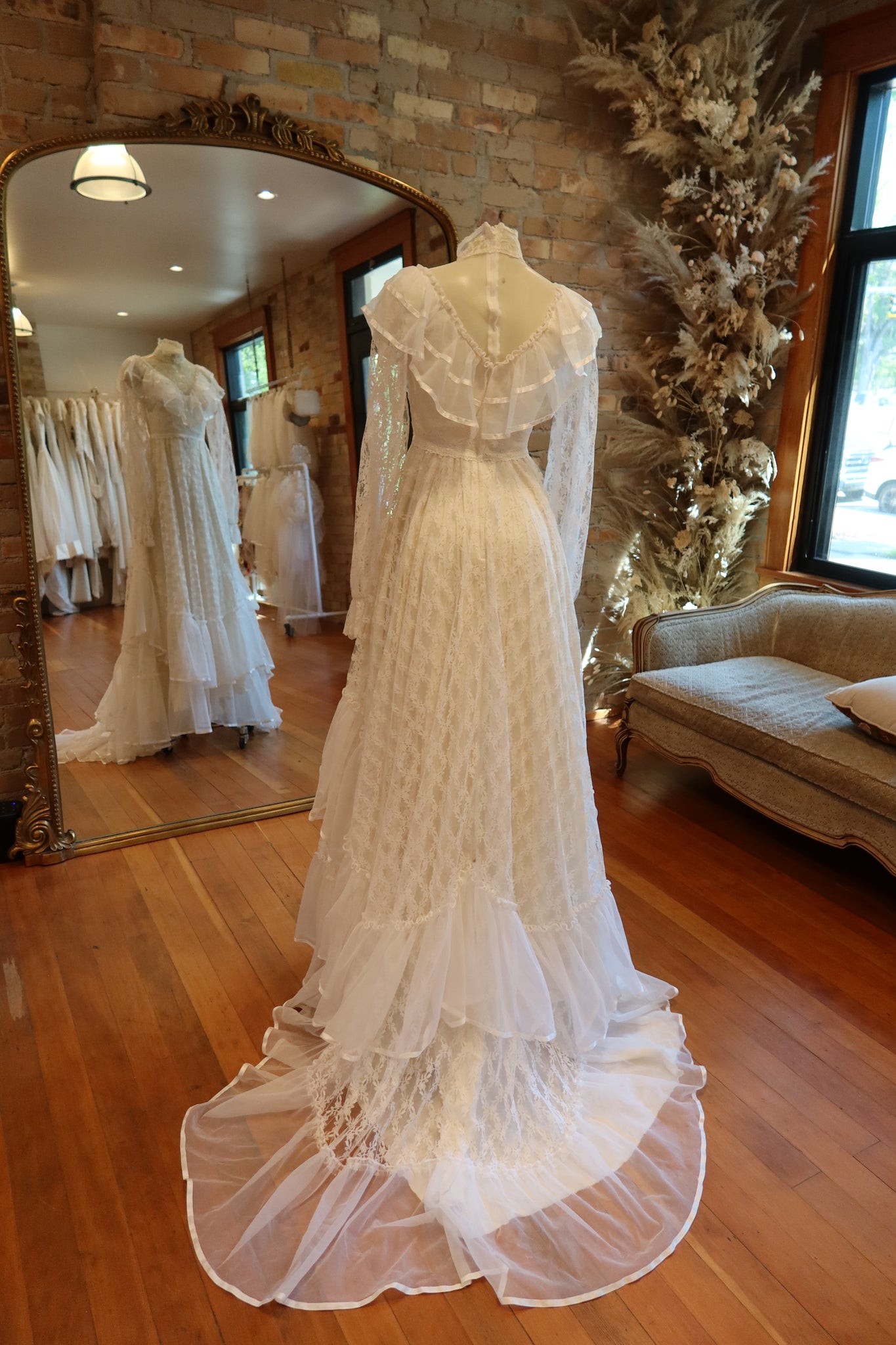 A true romantic’s dream! This vintage lace gown brings all the Victorian vibes with its high neckline, dreamy ruffles, and sheer lace sleeves. The tiered chiffon skirt flows with every step, making it perfect for brides who want timeless elegance with a touch of whimsy.