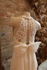 Stunning. Halter A-line featuring a dramatic lace back and cascading chiffon bow. Fully lined with a back zip and neck hook closures.