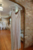 Misty mint green floral lace gown featuring sheer pink lining and delicate lavender, pink, and green embroidery. Feminine and ethereal, this vintage beauty drapes effortlessly with a soft, romantic feel